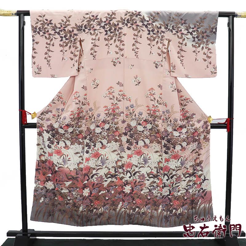 ピンクに裾は薄グレーの華やかな付下げ。肩回りには、枝垂れ花。裾には、百合や女郎花、菊、牡丹などの秋草に蝶々がさりげなく表現されております。柄が多く、大変華やぎ感のあるスタイルとなっております。明るすぎないピンクが、大人の女性にも楽しめる雰囲気を醸し出しております。
