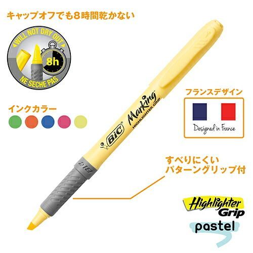 発色がよく裏移りしない高品質な蛍光マーカーに、人気のパステル色が新しく登場!!しっかり握れるグリップ付でぶれずにきれいにラインが引けます。全6色。しっかりと握れるグリップ付き。8時間キャップオフでも乾かない、にじまない水性インクを採用。【検索ハッシュタグ】#BICジャパン#水性マーカー#マーカー#ペン#マーキングハイライター#パステル#グリーン