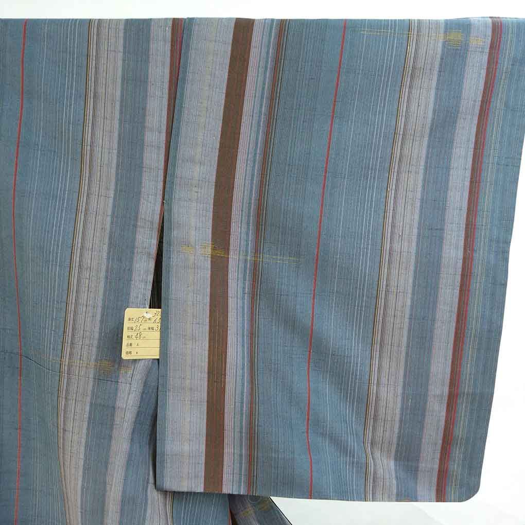 正絹の単衣紬着物です。ややブルーかかったグレー地に縦縞模様でカジュアル用途にお召しいただけます。身長152cm-162cm程度、標準体型からややふくよかな方にお勧めサイズです。広衿仕立て。裄の縫い代は4.5cm程度ありそうです。