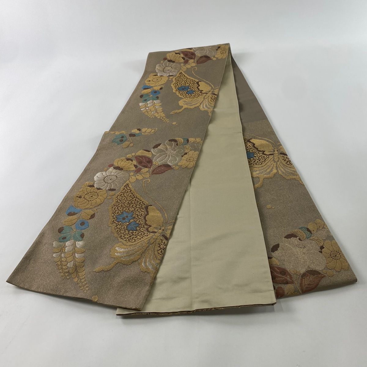 袋帯 落款 草花 蝶 金糸 輪奈織 薄茶色 六通 正絹