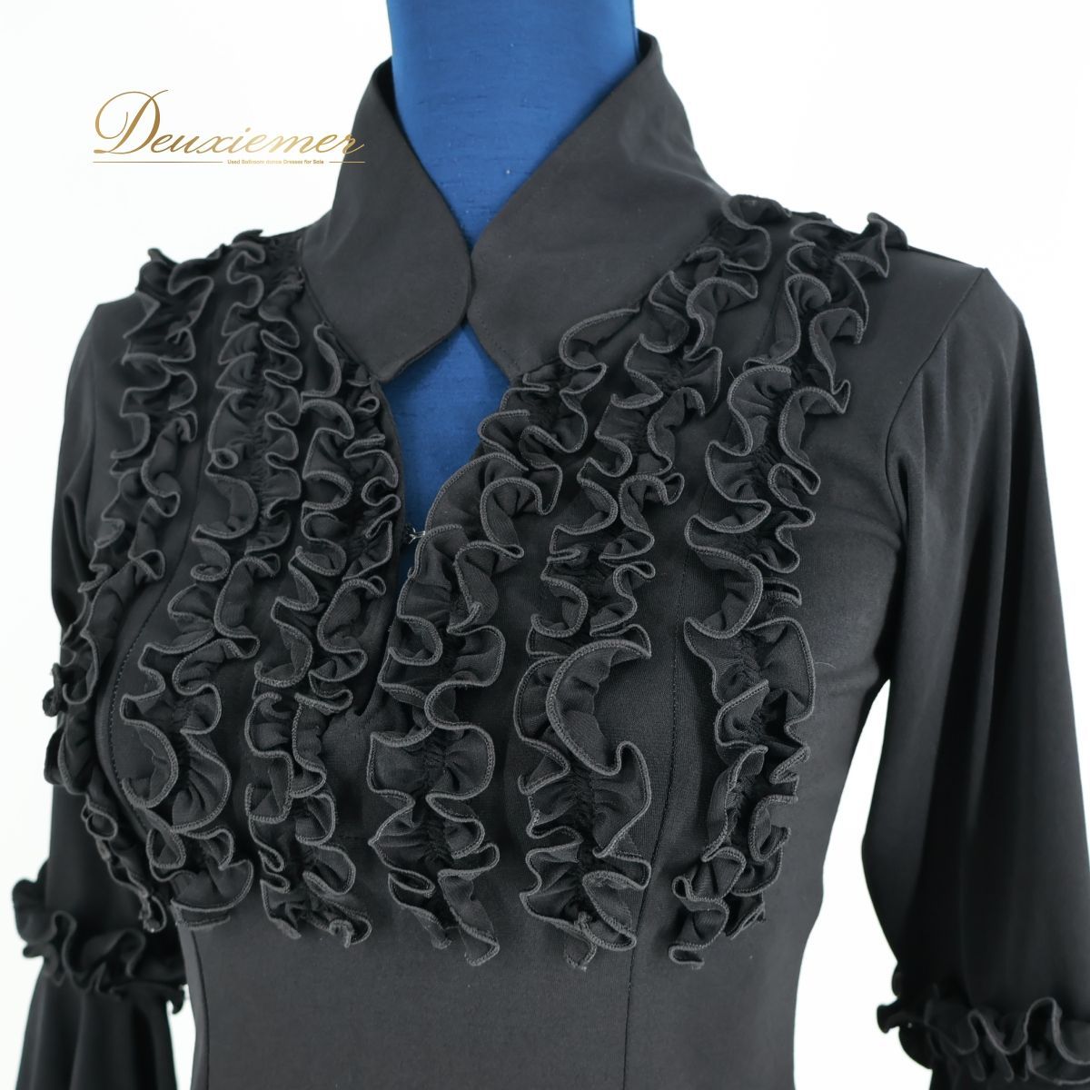 フラメンコ衣装 ブラック系 DOCE del FLAMENCO ドセデルフラメンコ トップス ブラウス 黒 フリル 無地 ストレッチ 伸縮 襟 フラメンコ おしゃれ デザイン かわいい 袖フリル ダンス衣装 体型カバー