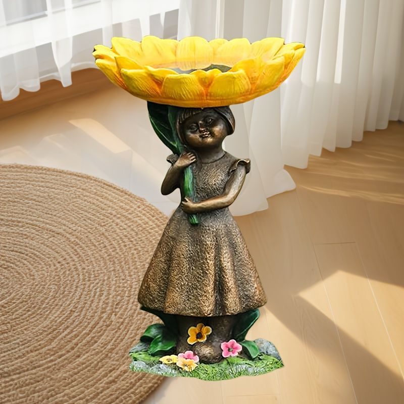 バードフィーダー 小鳥 野鳥 用 給餌器 餌箱 餌台えさ置き 置物 餌入れ 鳥 ガーデンオブジェ インテリア ガーデニング ペット食器 野鳥観察 大きいヒマワリを持っている少女 バード用品 インテリア雑貨 樹脂