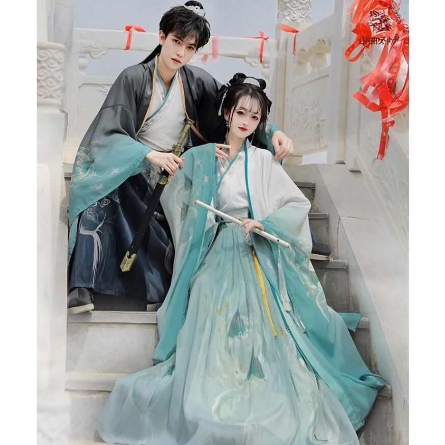 高品質 チャイナ服 上下3点セット メンズ レディース 大人 ペアルック グラデーション 白緑 黒緑 漢服&唐装 華流コスプレ衣装 中国古代服装 ハロ
