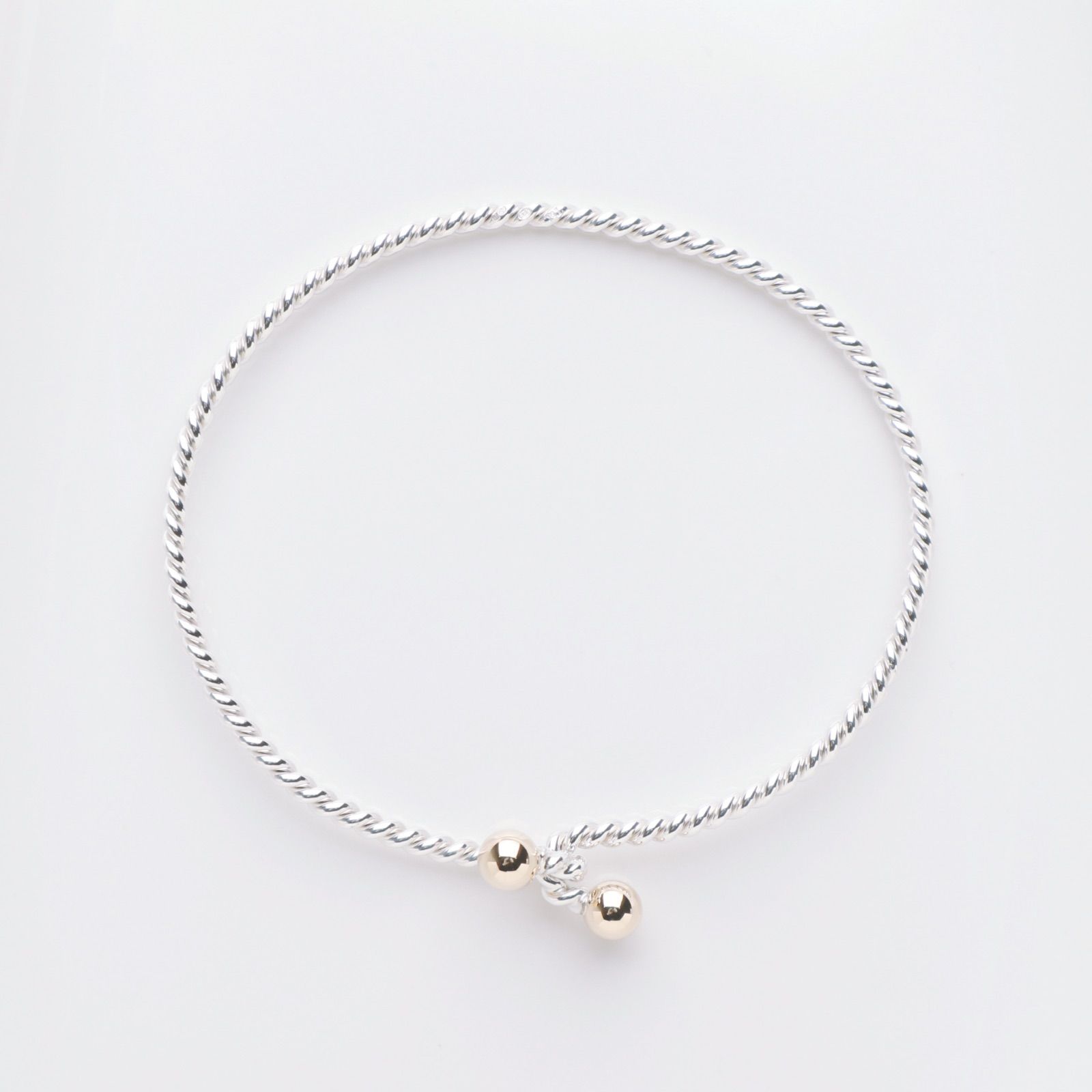 細やかに撚られたロープ状のシルバーが手首をやわらかく囲み、両端のゴールドボールが小さな重心として存在感を添えています。