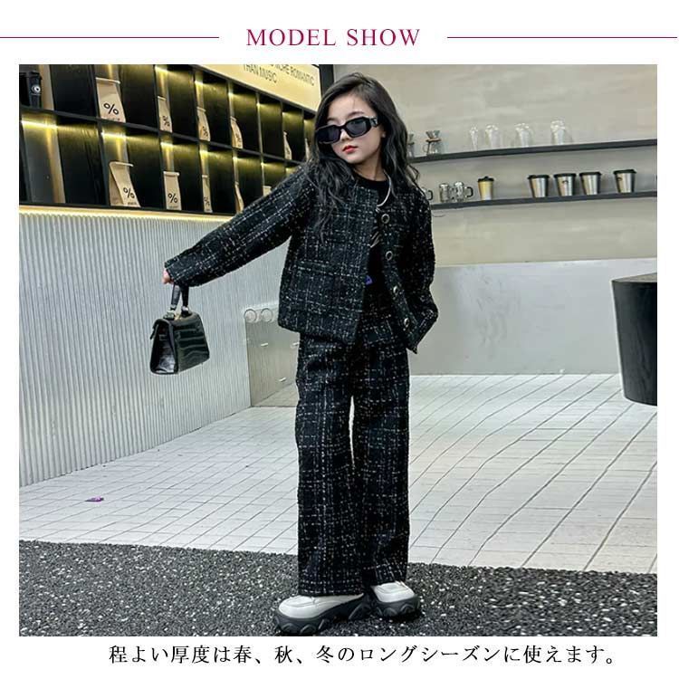 チェック柄 2点セット フォーマルスーツ ジャケット 卒業式 スーツ 長袖ジャケット 子供服 女の子 セットアップ ツイード ノー 入学式 ロングズボン 結婚式 キッズ服 ガー cjfj 143032