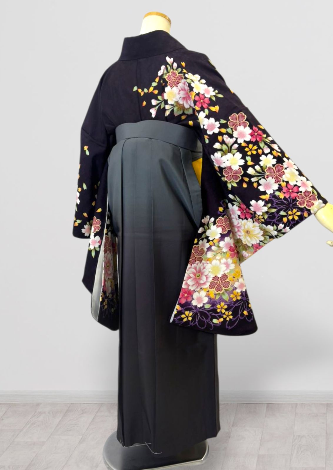 濃紺地に梅や桜のような小花が描かれた二尺袖の着物と、グレーのグラデーションの袴の組み合わせ。