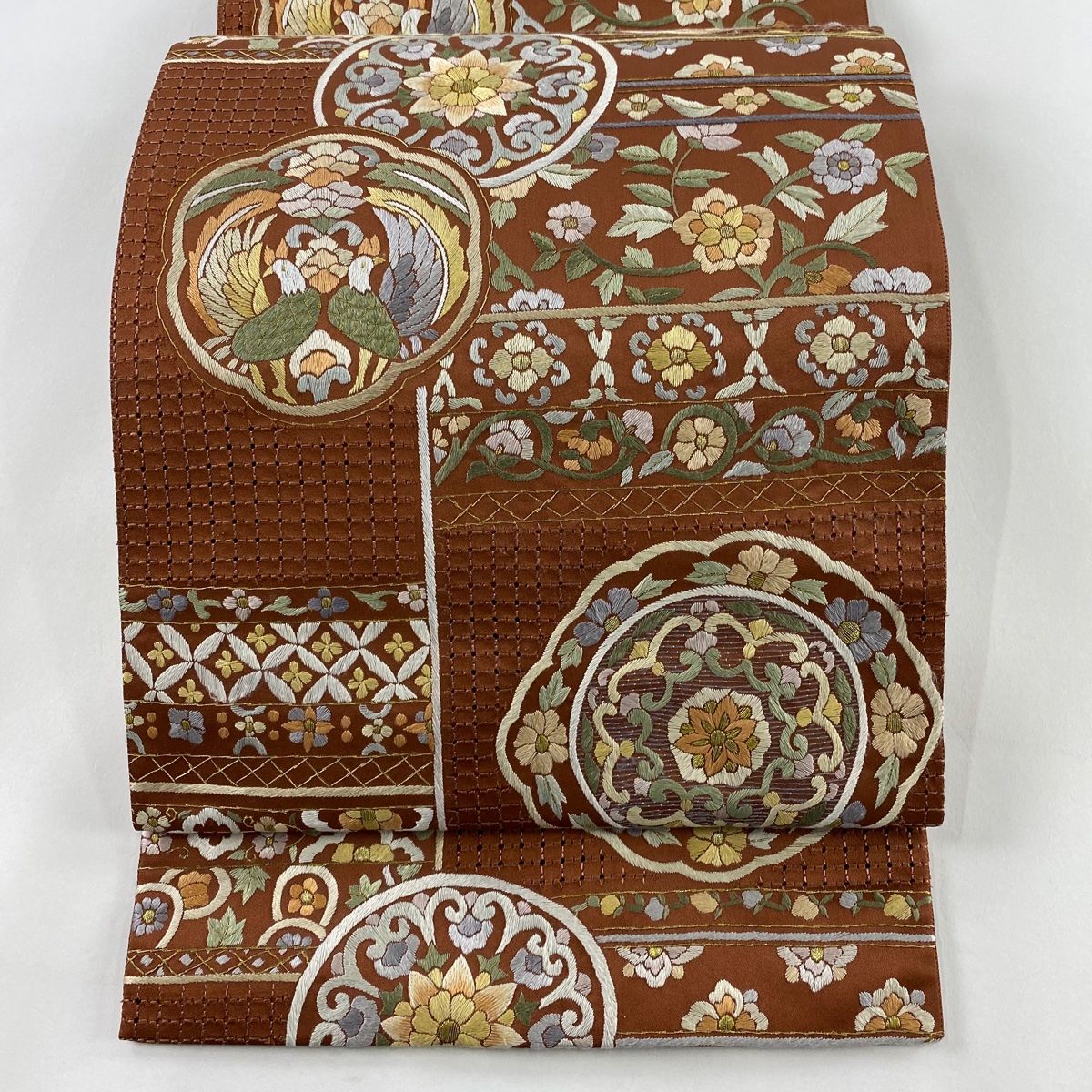 袋帯 華文 向かい鳥 刺繍 金糸 茶色 六通 正絹