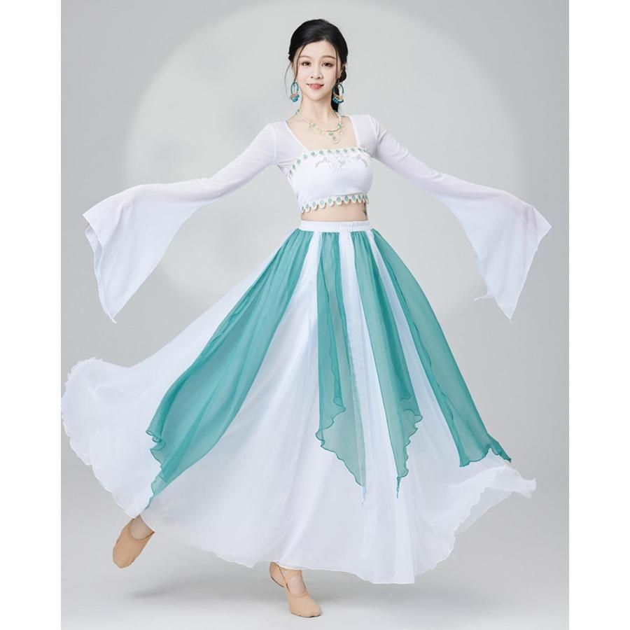 高品質 中華 アラビアン 衣装 中華古典舞踊 漢唐 中華宮廷舞踊 西域 敦煌 飛天 チャイナ古典民族ダンス 衣装セット 白 青 ひらひら 飄々 改良 漢