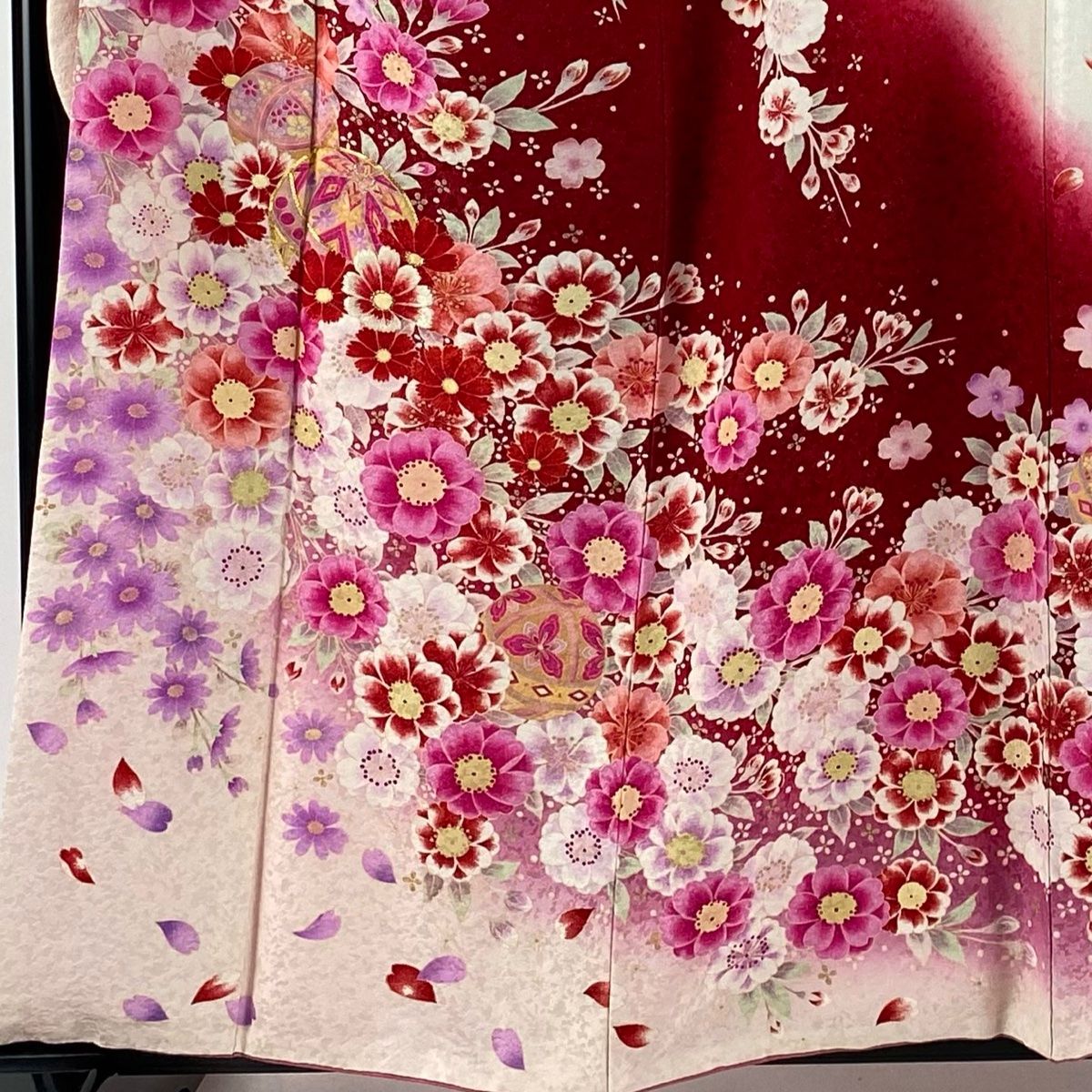 振袖 身丈157 cm 裄丈64 M 袷 手鞠 草花 銀通し 金糸 赤 正絹
