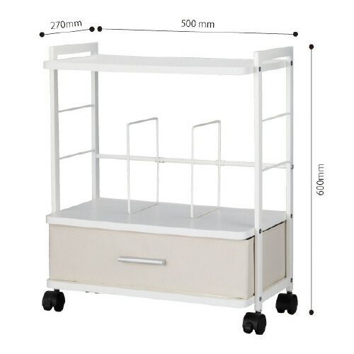 ●キャスター付き収納ワゴン●引出内寸法/W465×D220×H115mm●耐荷重/天板:約5kg、棚板:約15kg●質量/6900g●材質/天板・棚板:メラミン化粧板、フレーム:スチール(粉体塗装)、引出し:ポリエステル・板紙●組み立て式●付属工具/六角レンチ・スパナ※組み立てにはプラスドライバーが必要です。●サイズ/W530×D270×H600mm●色/ホワイト●入り数/1台