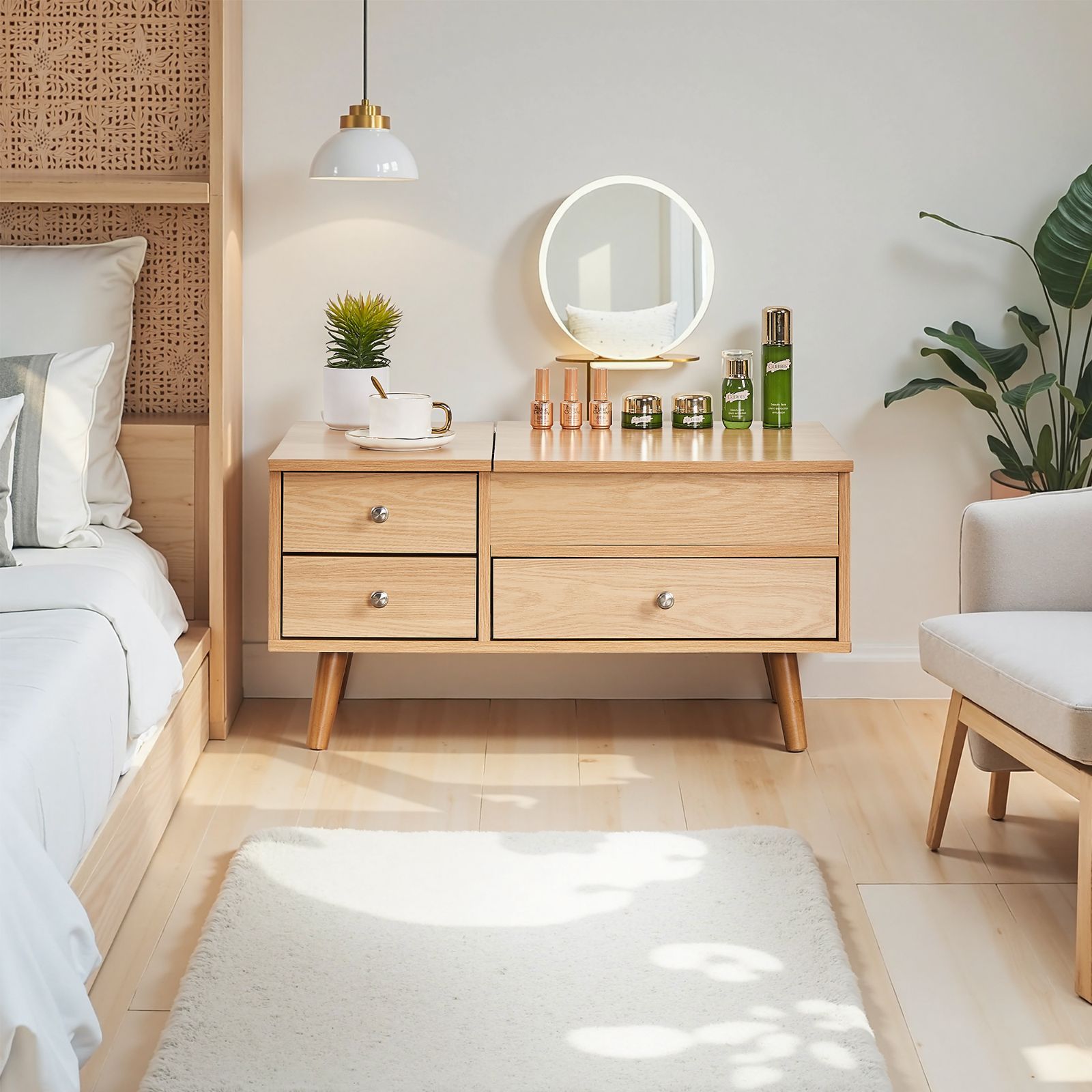 【多機能デザイ】 ドレッサーとしてはもちろん、ローテーブルやリビングテーブルとしても使用可能。シーンに合わせて使い分けられる便利な多用途設計です。