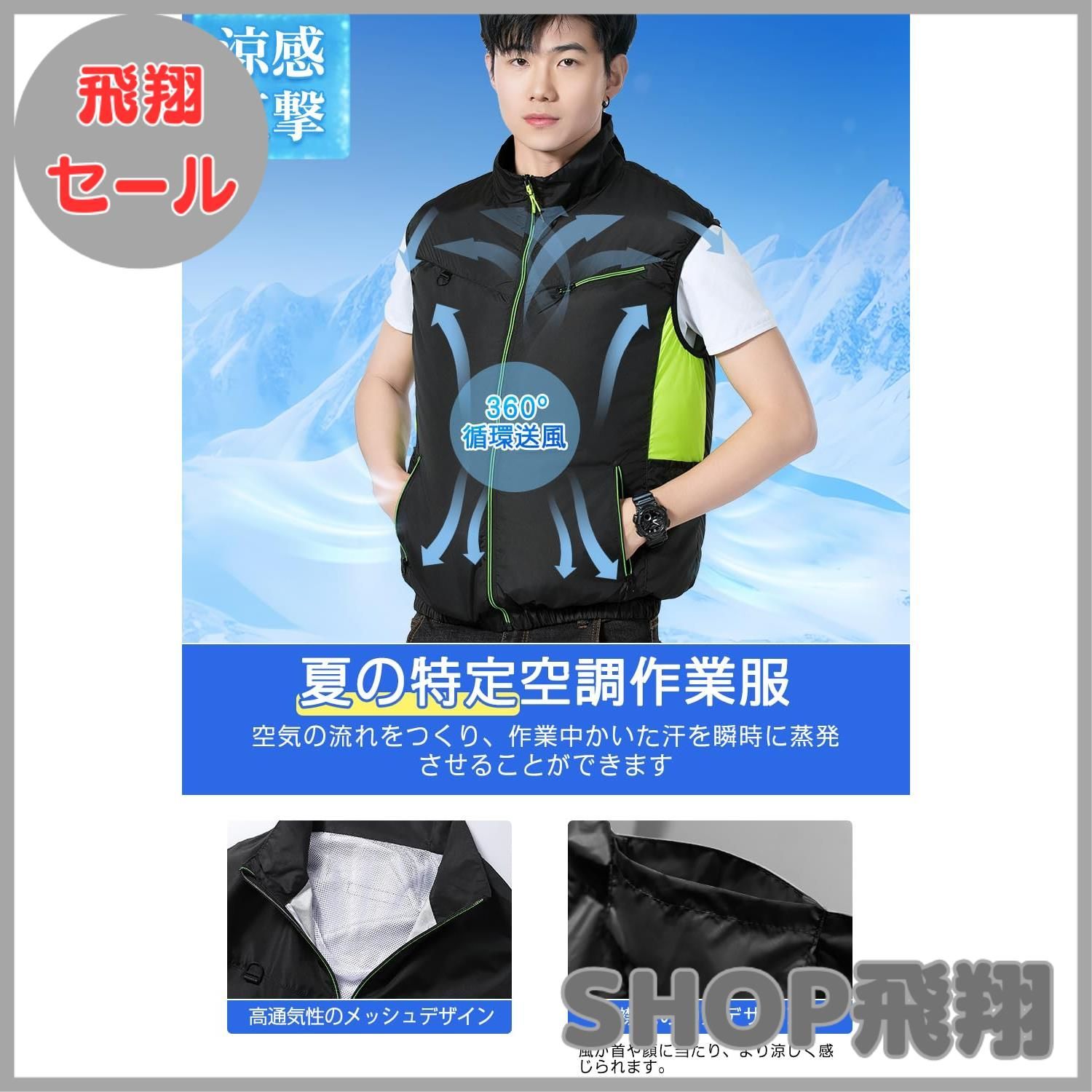 【ファン付きベスト空調作業服 & 熱中症対策】】セット内容:空調作業服*1、バッテリー*1、フアン*2、接続ケーブル*1、バッテリーへ充電用ケーブル*1。最新の直立ネックラインデザインで3D換気効果を高め、首の周りの風を実現するのに役立ちます。腰の両サイドに設置され、強力な風力で冷却ベスト内部で空気の循環を生み出し、人体から発散する熱を素早く吹き飛ばすことができます。ファンのカバーは両手で簡単に取り外せるため、清掃も簡単で常に快適に使用できます。(洗濯する際には必ず空調作業服のファンセットやバッテリーを取り外すようにしてください。)