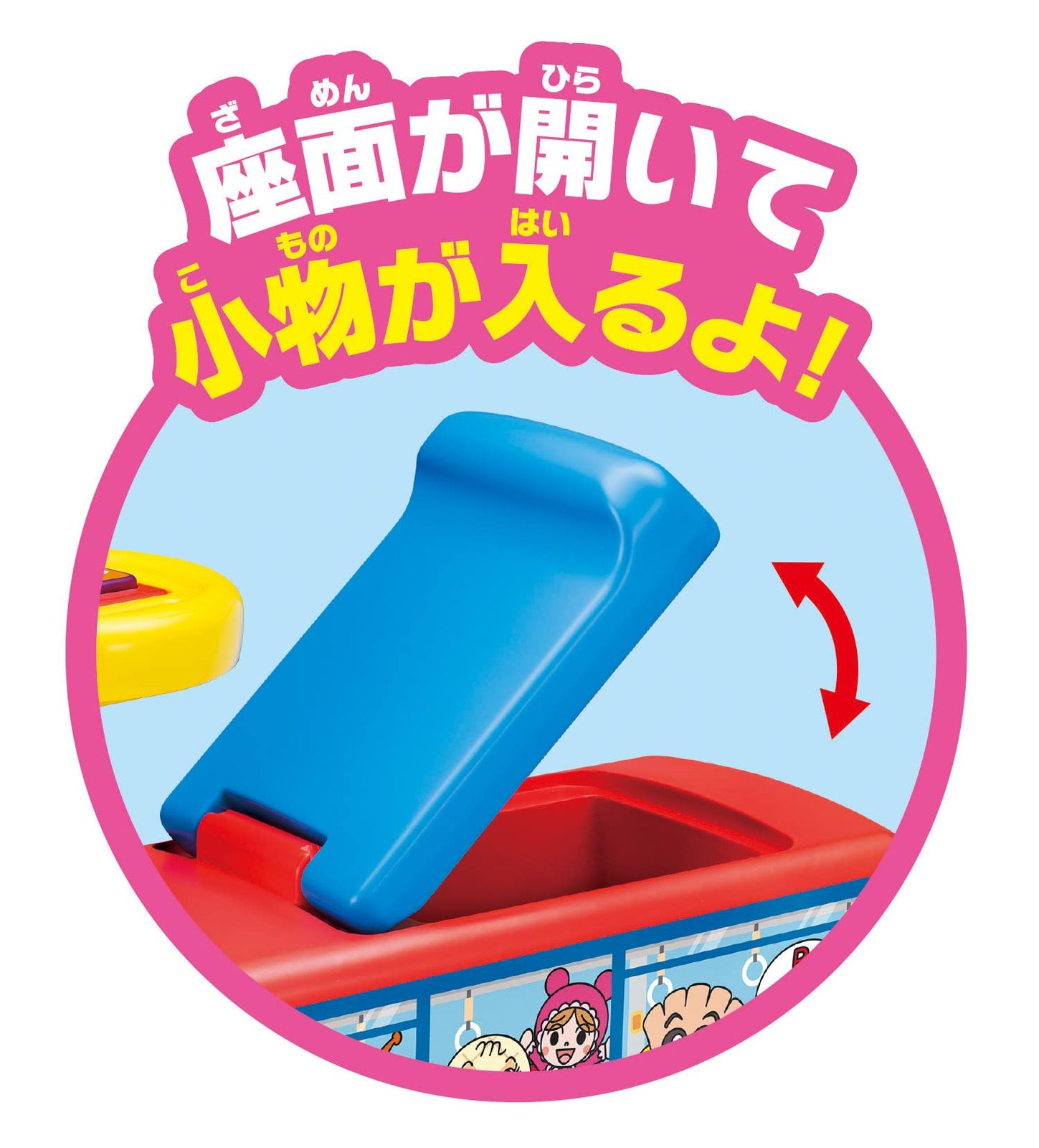 子どもの好きなバスの形をした乗用玩具です。アンパンマンのおしゃべり4種類が収録されています。「アンパンマンのマーチ」のメロディが収録されています。お部屋で遊ぶのに最適なコンパクトサイズです。人気の小物入れも完備しています。