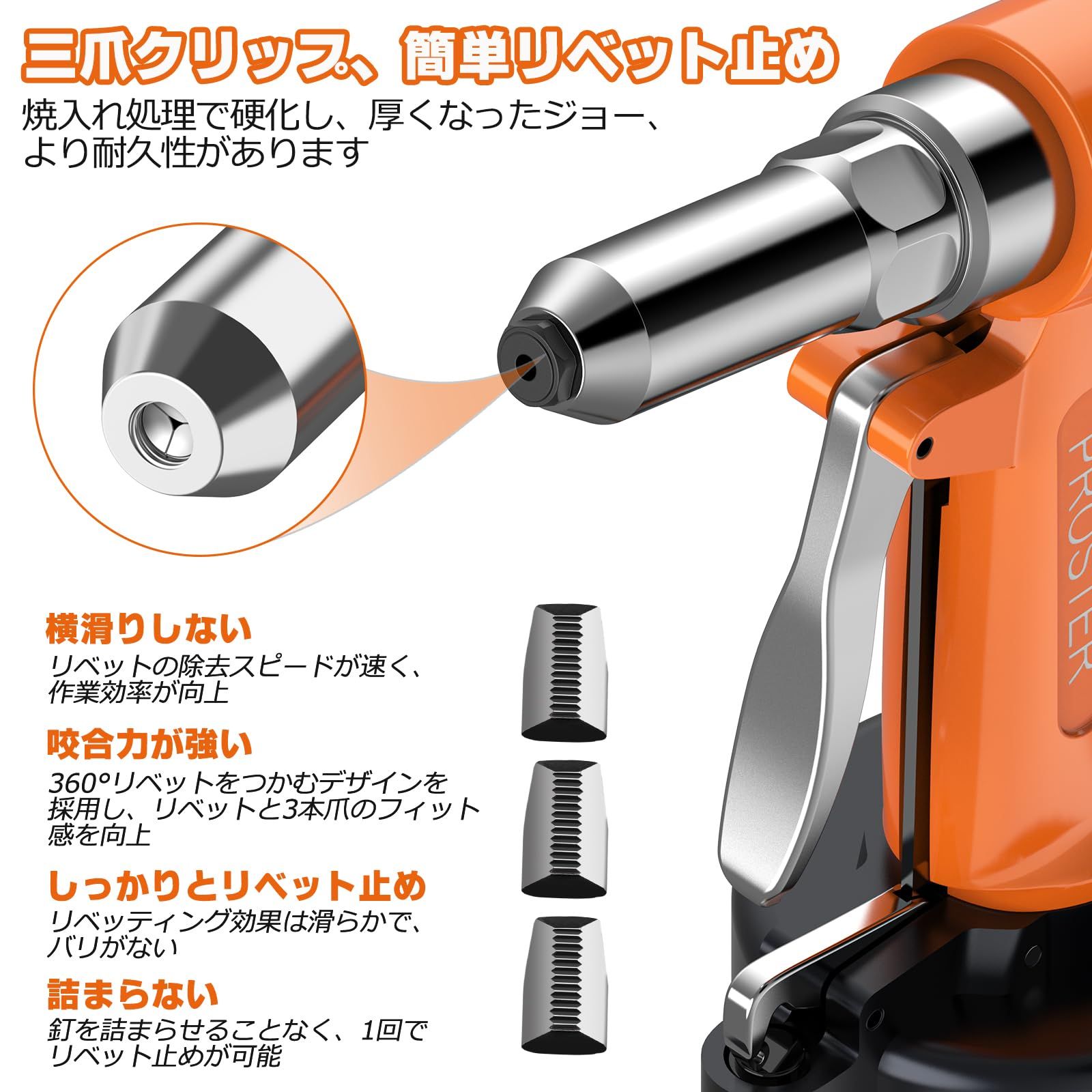 【高品質】良好な硬度、強い耐摩耗性、1780KGFの引張り圧力、ステンレス鋼の釘に使用することができます。16mmの作業ストロークで異なる長さのリベットに対応します。滑りにくく、変形しにくいです。サイレンサーと排気口を内蔵し、作業時に発生する騒音を効果的に低減します。