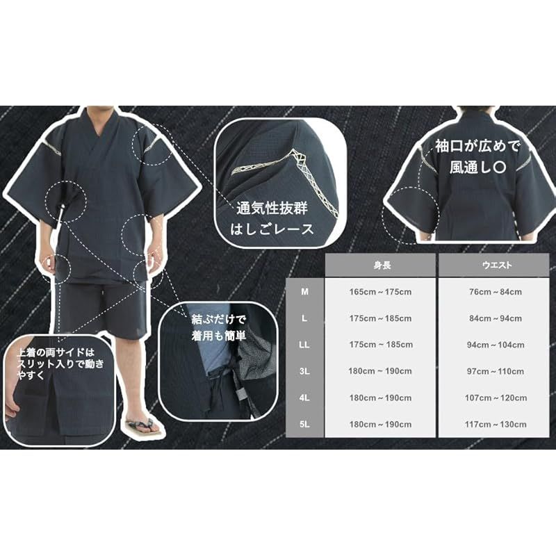 【5Lサイズ】 身長180cm~190cm ウエスト117cm~130cm----------お取り扱いについて--------------- ●この製品は摩擦等により、移染しやすいので十分注意して下さい。●出来るだけ、白い物、薄い色物との着合わせは避けるようお願いします。 ●洗濯の際、色が落ちますので他のものと分けて洗濯するようお願いします。洗濯後は形をととのえてすぐに干して下さい。移染しますので他の製品と分けて保管して下さい。 ●漂白剤のご使用はお避け下さい。 ●タンブラー乾燥はお避け下さい。 甚平・作務衣は贈り物、お中元などにも人気です。