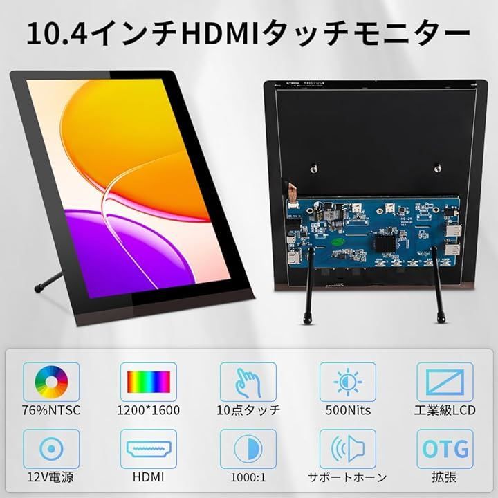 「鮮明な表示のコンパクトモニター」この10.4インチタッチモニターは、1200x1600の高解像度、500ニトの明るさ、1000対1のコントラスト比、1680万色に対応。