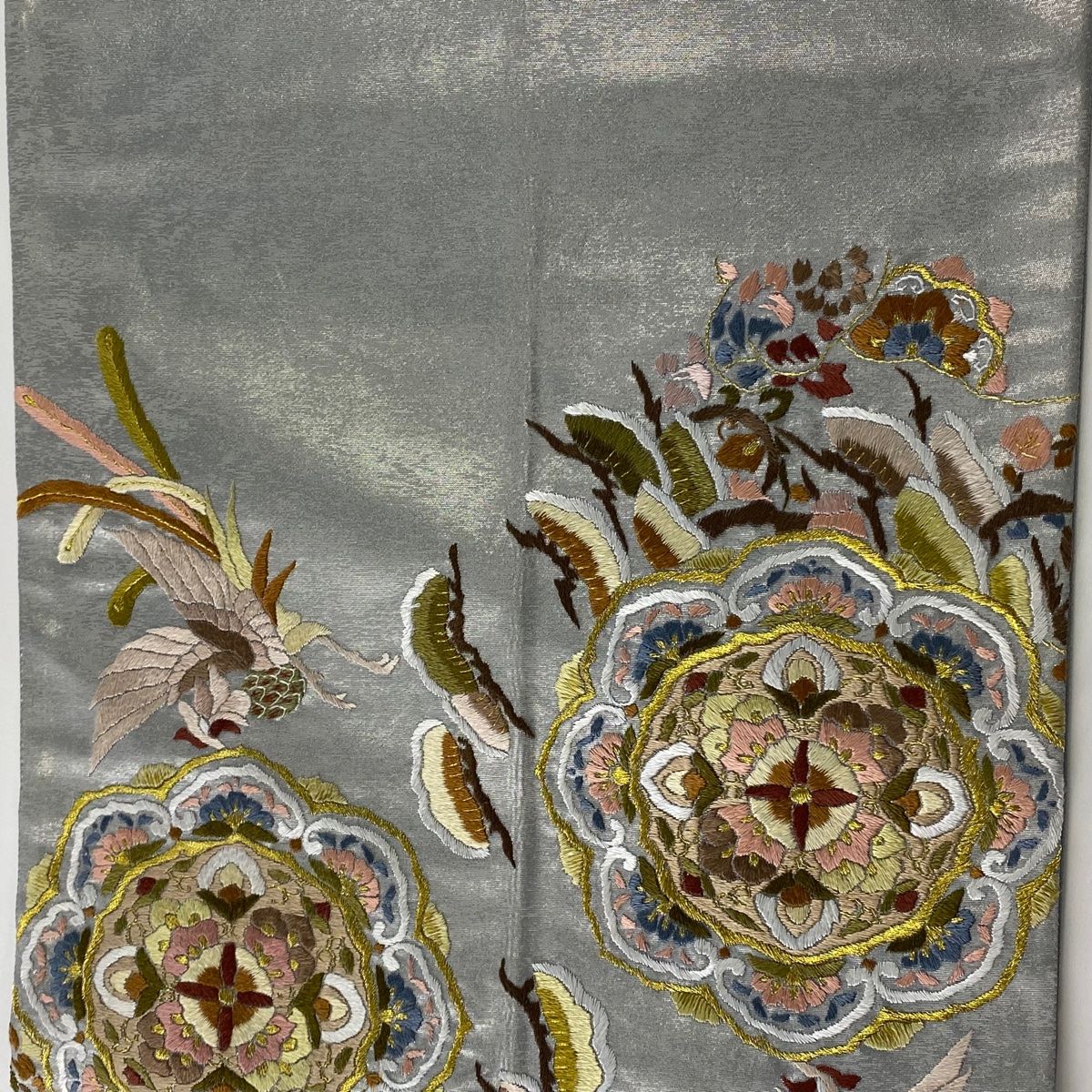 袋帯 秀品 華文 鳳凰 刺繍 金糸 灰色 お太鼓柄 正絹