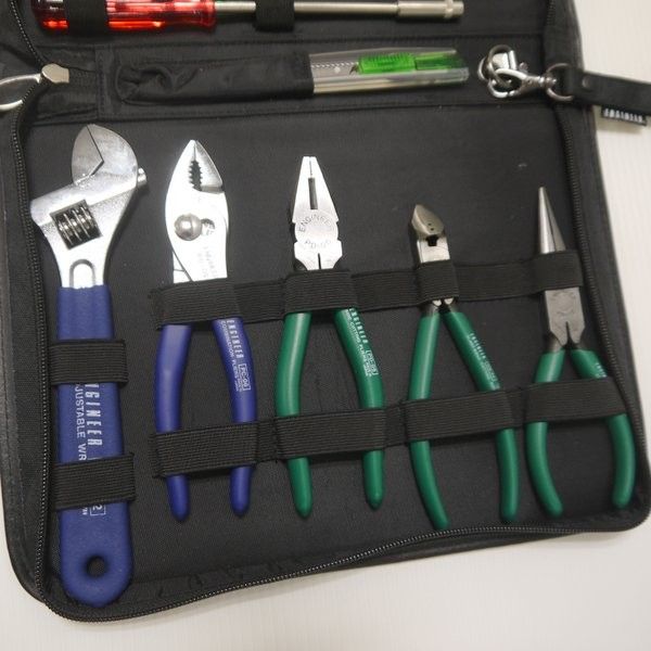 ・セット内容:NN-46/斜ニッパー、PC-06/コンビネーションプライヤー、PD-06/電工ペンチ、PR-16/ラジオペンチ、PTS-02/ピンセット、DA-02/調整ドライバー(-2.0×0.5mm)、DS-03/ドライバー(+No.00)、DS-23/ドライバー(+No.0)、DS-64/ドライバー(+No.2)、DS-13/ドライバー(-2.6×0.35mm)、DS-54/ドライバー(-5.5×0.7mm)、DN-05/ナットドライバー(対辺5.5mm)、TWH-04/六角レンチセット(8本組)、TWM-02/モンキーレンチ、ヤスリ(平)、ヤスリ(丸)、キャップ付ハンダコテ(30W)、SW-30/糸ハンダ、直尺(150mm)、カッター