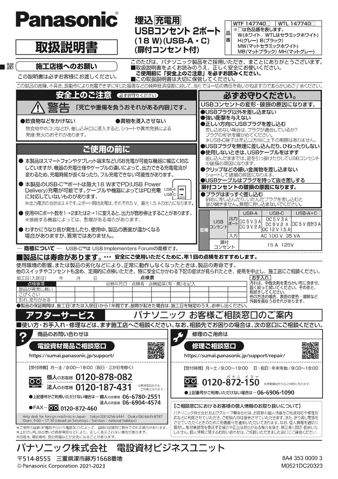 パナソニック Panasonic 埋込充電用USBコンセント2ポート マットブラック 18 W 44 50 110 mm USB A C 扉付コンセント付