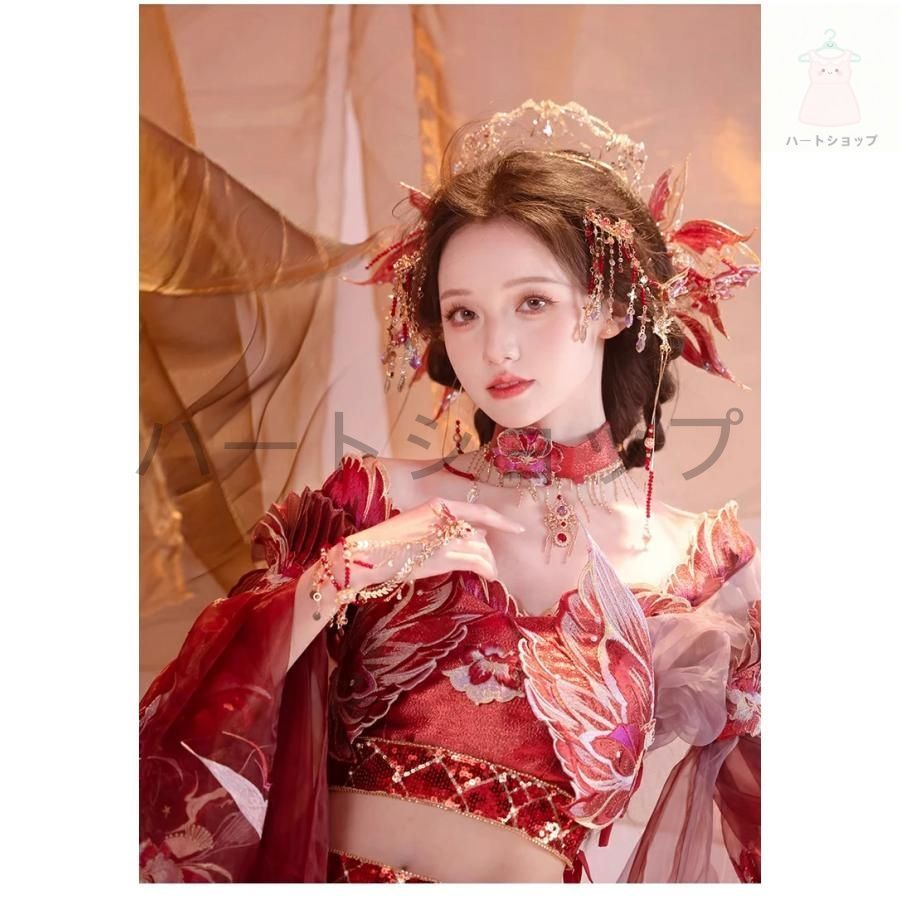 敦煌異国風漢服 中華風 3点 4点セット 赤金系 チャイナ服 華やかな刺繍 仮装 コスプレ服 人魚姫風 チョーカー コスプレ へそ出し セ