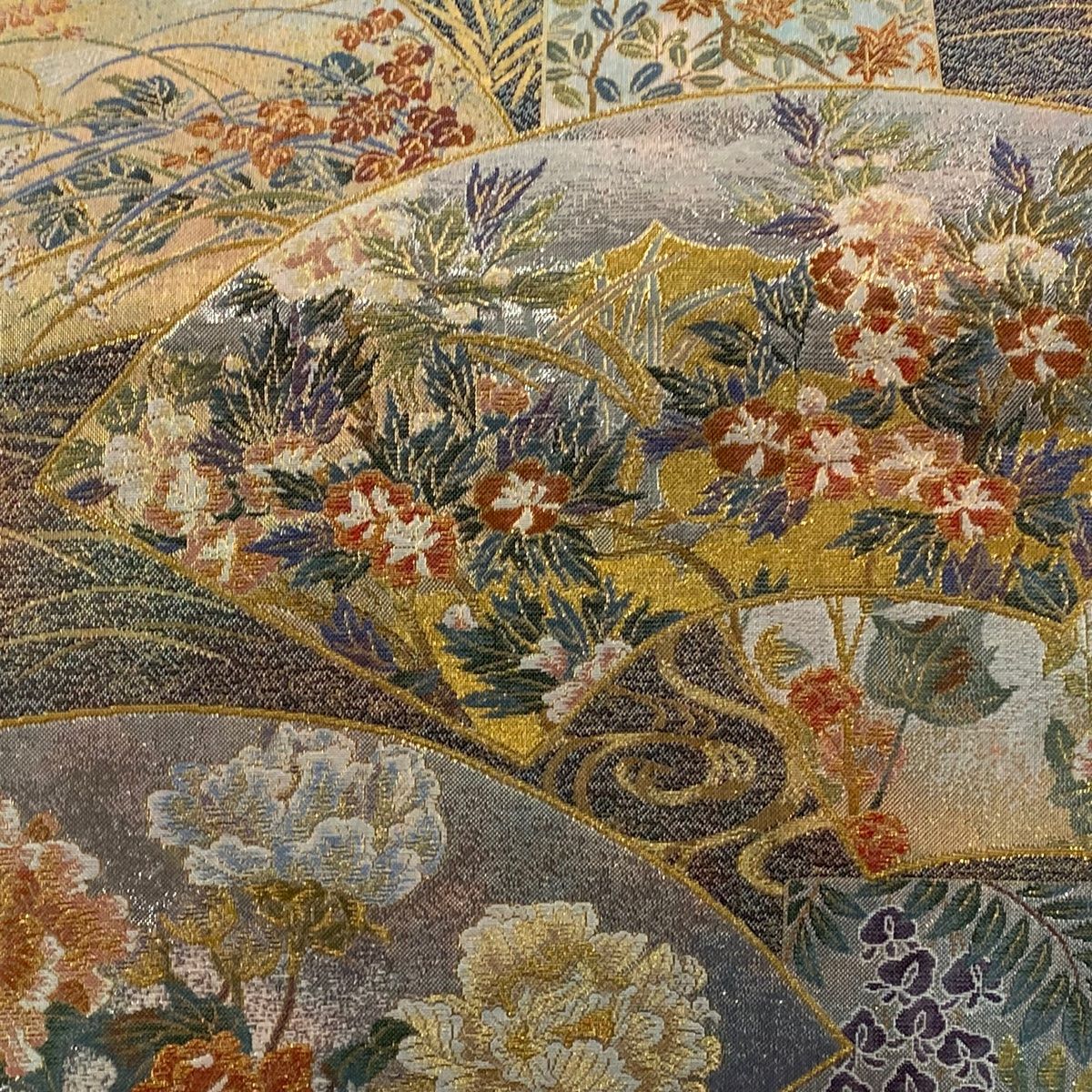 丸帯 扇面 人物 金糸 箔 灰色 お太鼓柄 正絹