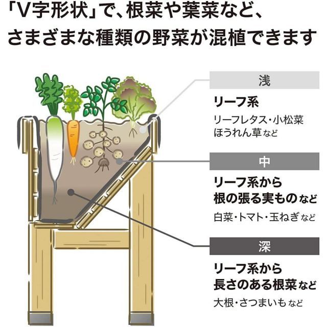 立った姿勢でお手入れがしやすく、椅子に座ったままでもプランターの下に足が入るので、植え付けや収穫などの作業がしやすくなります。