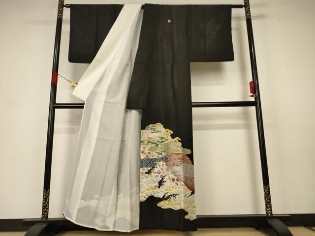 平和屋着物 夏物 アンティーク 大正ロマン 黒留袖 絽 刺繍 立波吉祥文 金糸 金銀彩 正絹 jd