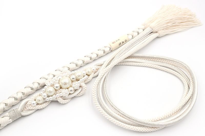 帯締め 飾り紐 振袖用 長尺 Lサイズ 正絹 成人式 白 銀 パール ビーズ 丸組紐 翠嵐工房 フォーマル セミフォーマル 礼 No.10-6822