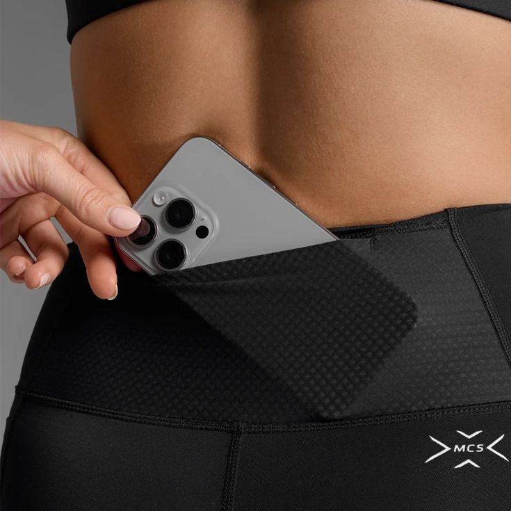 体のラインにフィットする軽量ハイライズウエストバンド。背面には携帯電話を収納できるメッシュポケット、両サイドには栄養ジェルやカード、鍵などを収納できるポケットを装備。