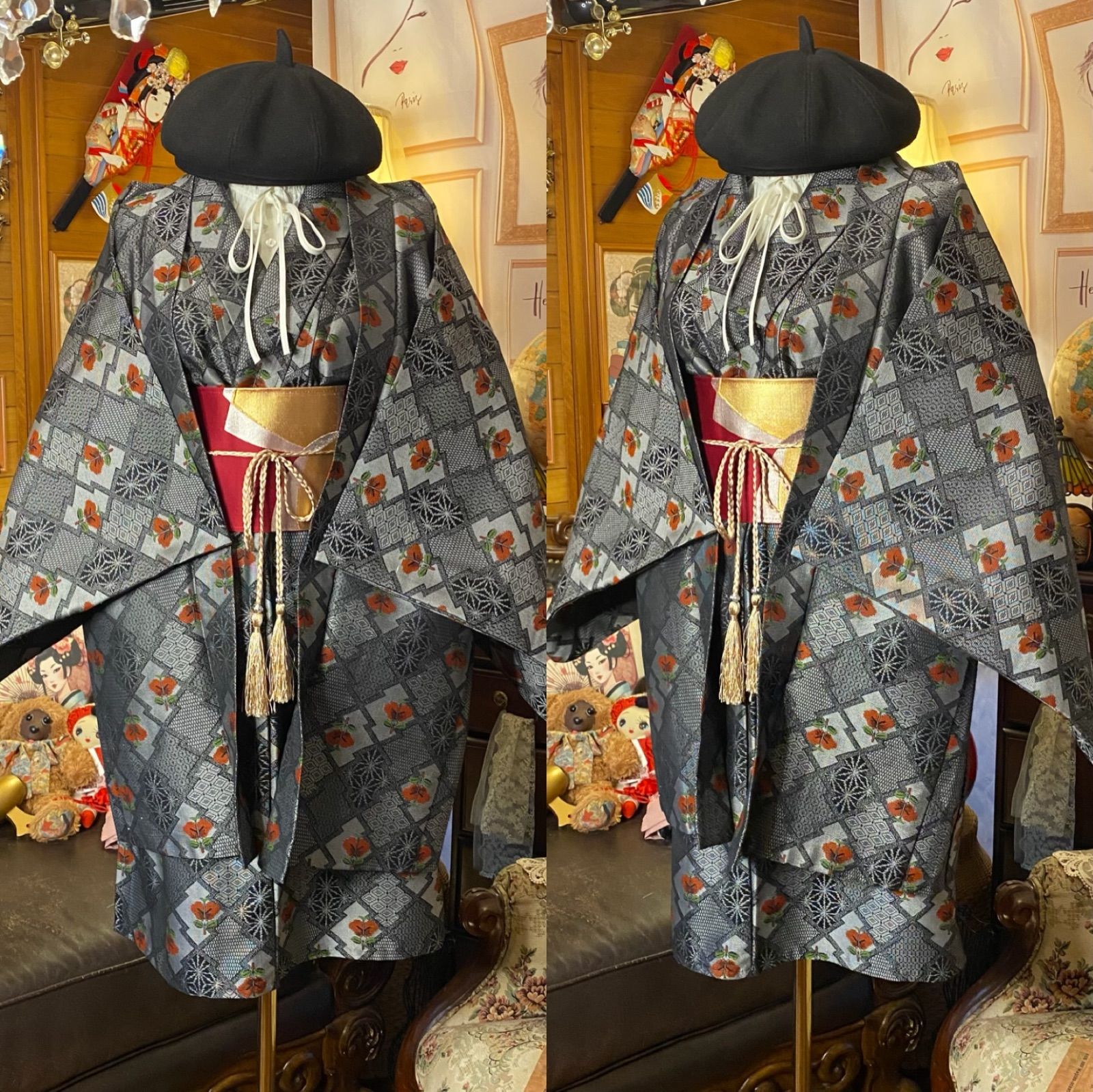 落ち着いた墨鼠〜チャコールを基調に、市松や麻の葉、小紋をモザイク調に配した総柄。ところどころに錆朱の花が咲き、レトロな艶感と温かみのある差し色が映えます。深紅×金の帯ベルトとゴールドタッセル紐でウエストマークすれば、式典や撮影にも映えるモダン和洋ミックスに。ベレーやブーツとも相性抜群—日常のレトロコーデから特別な一日まで品よく格上げしてくれる一着です