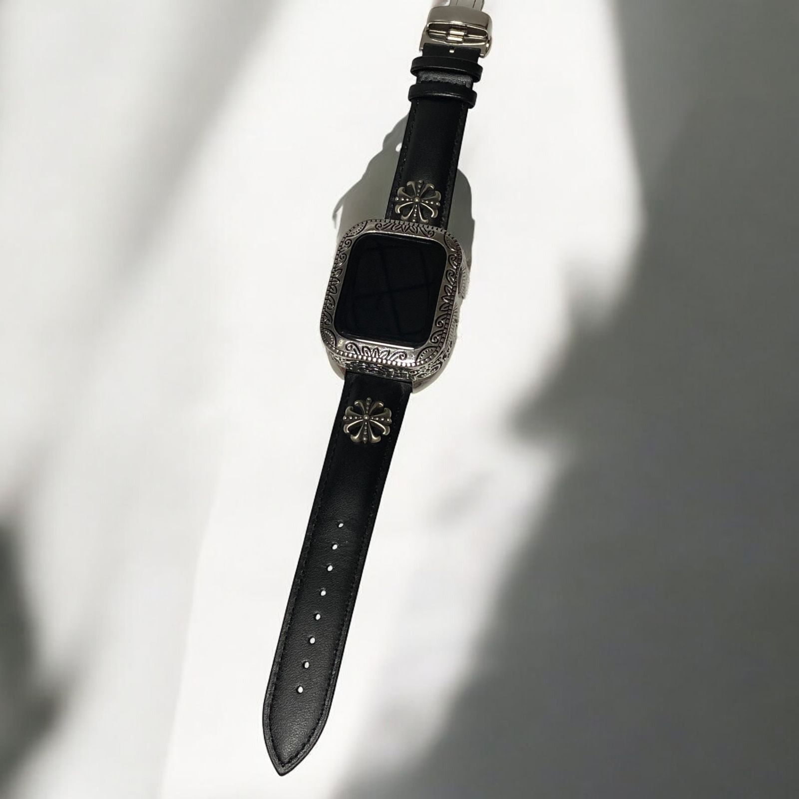 重厚感あふれる彫刻調のメタルカバーと、上質な牛本革を使用したレザーバンドを組み合わせた、Apple Watch専用のラグジュアリーカスタムセットです。