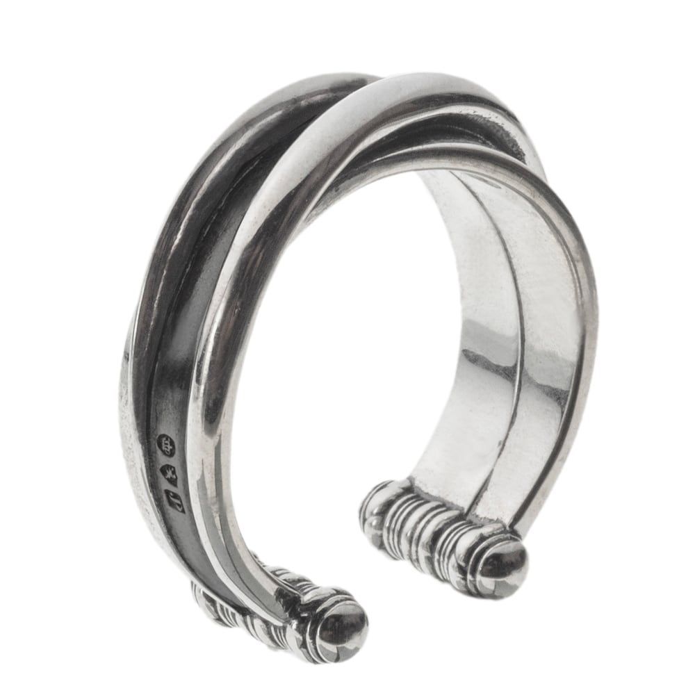 平打ちリングに太めと細めの甲丸リングが立体に重なり合ったトリッキーなデザインリング。ボリューム感があり、手元をオシャレに引き立てる逸品。光沢のある銀の質感を活かし、銀の煌めきを存分に楽しめるシンプルなフォルムが魅力。カジュアルからフォーマルまで幅広いシーンで活躍するアイテム。ユニセックスデザインでペアもおすすめ。サイドのブランドとホールマークの刻印がデザインアクセント。フリーデザインの支柱はアンティークなターニングレッグデザイン。