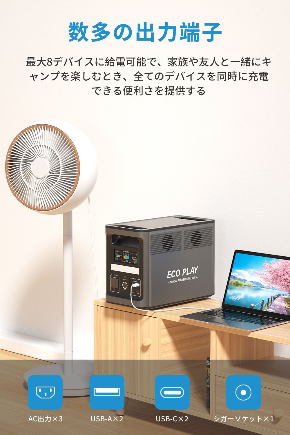 「キャンプや防災に最適!8デバイス同時給電対応」家族や友達とのアウトドアに、万が一の非常時にも頼れるポータブル電源!このポータブル電源は、AC出力×3、USB-A×2、USB-C×2、シガーソケット×1の計8つの出力端子を搭載し、スマートフォンや家電、電動工具、車載機器など、さまざまなデバイスに対応します。キャンプやアウトドアでは、1〜2日間使用できる十分な容量を誇り、複数の機器を同時に充電できます。災害時の備えとして、またキャンプなどのアウトドアシーンでは、あらゆる電化製品の使用に大活躍。節電対策や防災用としても最適な非常用バッテリーです。