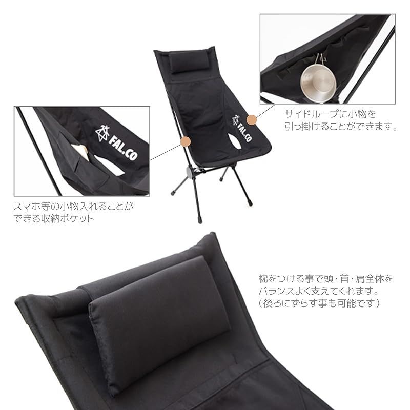FAL CO FOLD HOLD CHAIR ファルコ フォールドホールドチェア Utility High Back アウトドア キャンプ 折り畳み ブラック サイドポケット 釣り ハイキング フェス