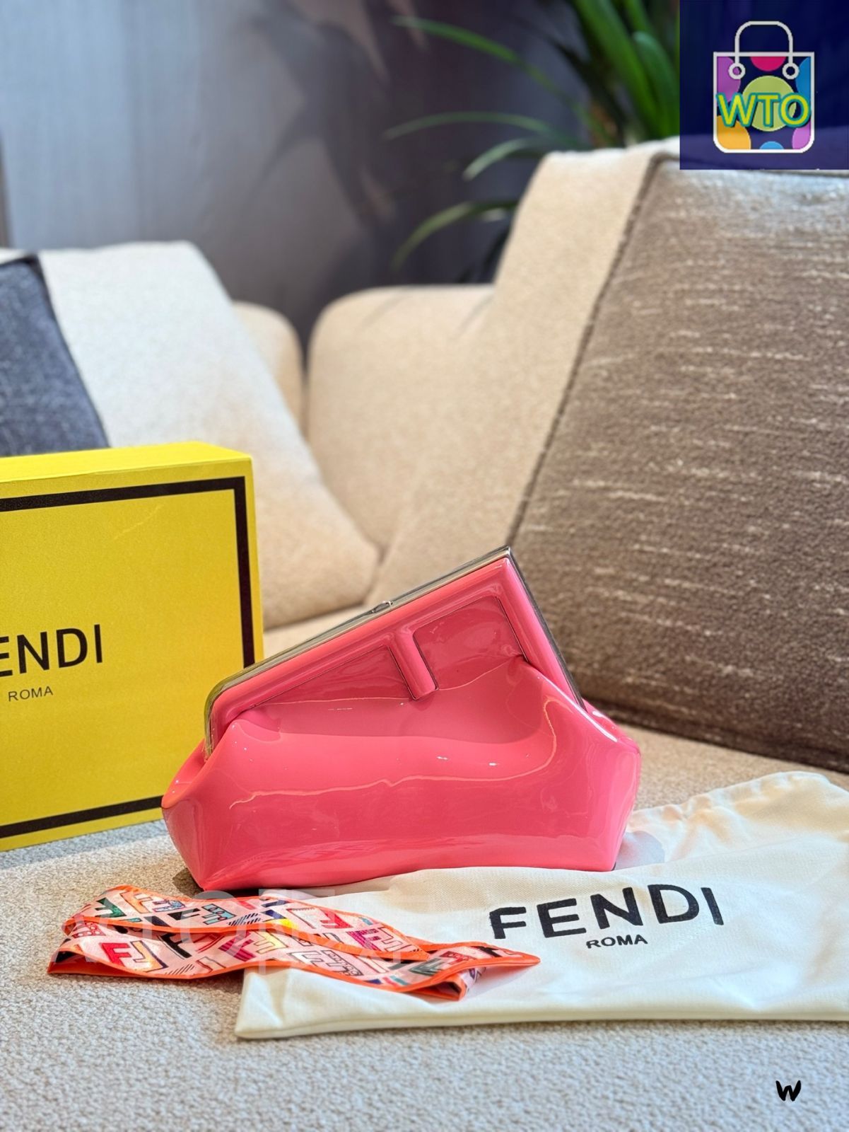 FENDIの「ファースト」シリーズのミディサイズバッグ。光沢あるパテントレザーとオーバーサイズのFロゴが特徴です。